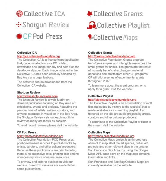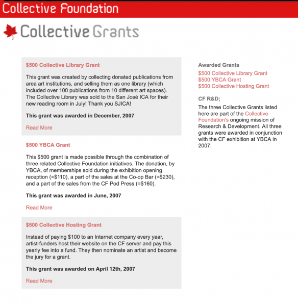 The exhibition featured a selection of unconventional granting endeavors, including Service Works by Josh Greene, the Co-op Bar by Steve Lambert and others. The propositional foundation also gave a series of grants that included one that collected surplus publications from area institutions, which were sold as a library survey of SF arts orgs to an institution in San Jose. The income became a grant that was awarded during the exhibition.