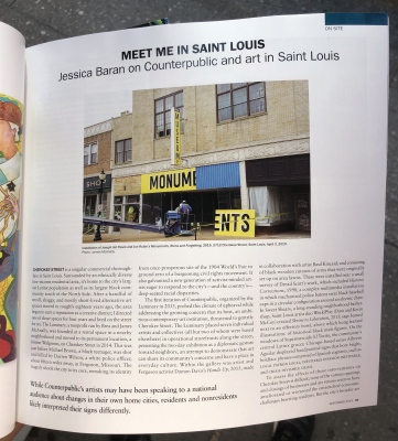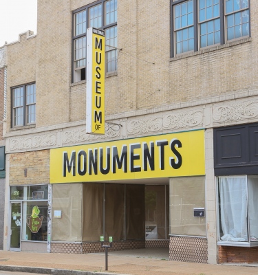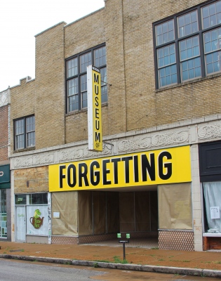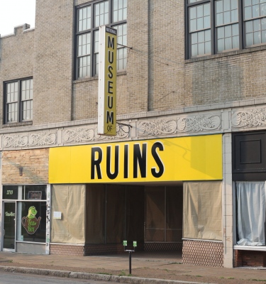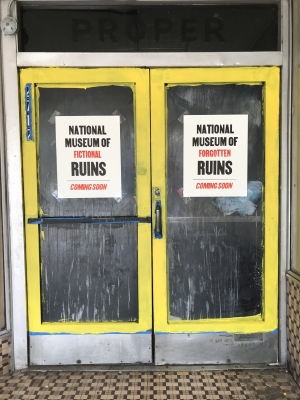 For the Counterpublic Triennial in 2019, Joseph del Pesco and artist Jon Rubin collaborated on a new commission, Monuments, Ruins and Forgetting, installed in an empty storefront on Cherokee Street in St. Louis, Missouri. The hand-painted signage was installated in three month-long stages, and was accompanied by letterpress posters appearing in the neighborhood. Monuments, Ruins and Forgetting inaugurated a new (and speculative) "National Museum" that—over the course of three months—presented a micro-narrative about historical progression.