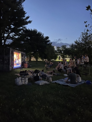 As part of recovering from athe COVID-19 global pandemic, in summer 2021 del Pesco and artist Liz Flyntz organized a free one-night screening in a public park of the unforgettable series 2 Lizards, by Meriem Bennani and Orian Barki. Using high-powered magnets to attach a canvas screen to an existing shipping container, and rotating nearby baseball bleachers, a Covid-safe outdoor cinema was created.