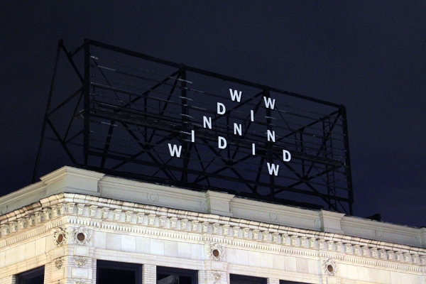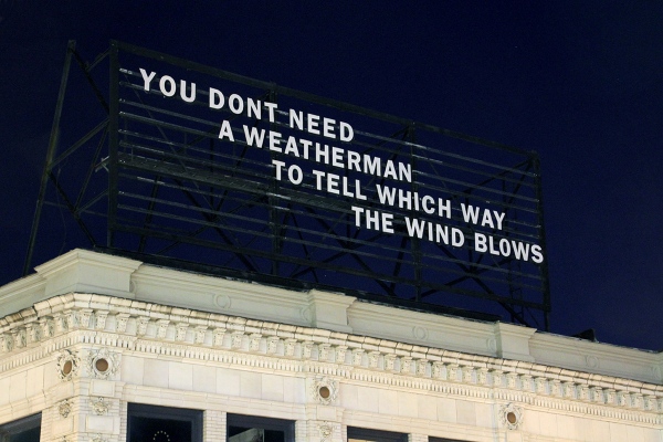 presented in a two part sequence. The first part presented a graphic poem from Eugen Gomringer’s book CONSTELLATIONS, 1953 (via Susan Howe’s The Quarry). The second part, presented a few weeks later, was a line from Bob Dylan’s song Subterranean Homesick Blues, 1965, as referenced by radical left-wing offshoot of the SDS, the Weather Underground (modified due to available letters, replacing KNOW with TELL)
