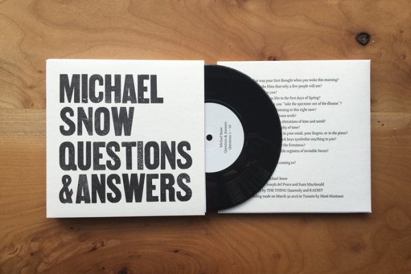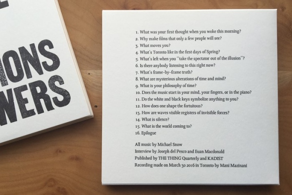 For an interview with legendary Canadian artist, filmmaker and pianist Michael Snow, del Pesco and artist Euan Macdonald posed fifteen questions—ranging from the the poetic to the philosophical—and Snow replied with short musical improvisations. Snow has, since the late 1940s, been a virtuosic jazz pianist, and has achieved such fluency with the instrument that his replies are quasi linguistic, communicating at the edge of language through variations in speed, intensity, and rhythm, through repetition and timbre, through the melodic and the dissonant. The responses to each question (listed on the verso of the record) are followed by an Epilogue, offering reflections on the subjects raised by the questions. del Pesco also designed and printed the sleeve with wood type, in black and white, to match the keys of the piano. The 7 inch record was published by The Thing Quarterly in 2016. The limited edition is sold out, but the audio can be heard online.
