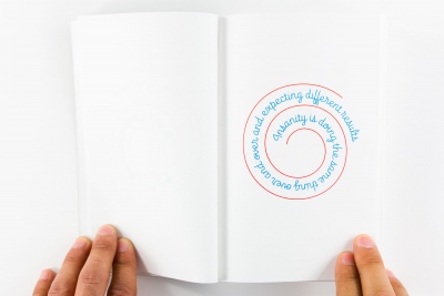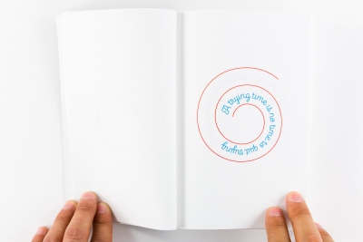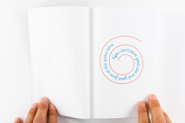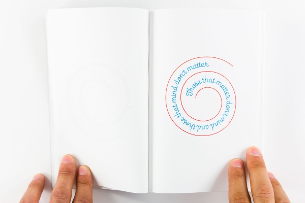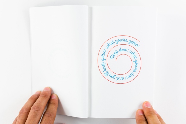 Published by KADIST in conjunction with Mungo Thomson's exhibition Wall, Window or Bar Signs, in 2014,The Big Bookfeatured hundreds of aphorisms used in the AA community but set in the Brice Nauman 'mystic truths' spiral. The typeface was design by OH no Type specifically for the unique conditions of a spiral. The book was designed by Jon Sueda.