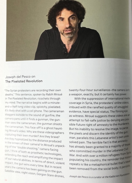 A short essay on the video The Pixelated Revolution, by Rabih Mroué, was del Pesco's contribution to the book: San Francisco Museum of Modern Art 360: Views on the Collection