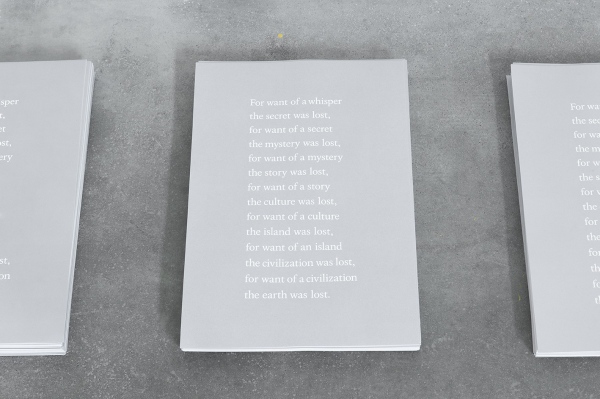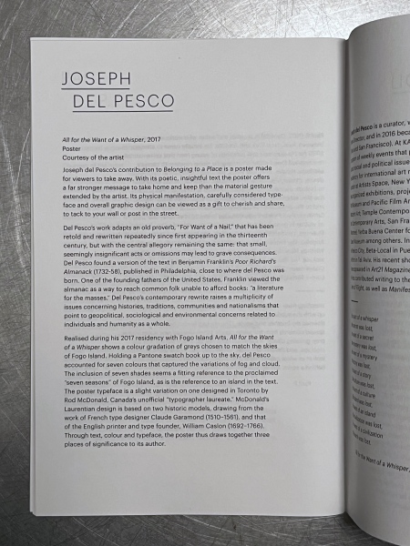 All for the Want of a Whisper was commissioned for an exhibition at Scrap Metal in Toronto. 7 stacks of take-away posters, printed in 7 different variations of grey, referencing the colors of the sky on Fogo Island, Newfoundland, Canada. del Pesco re-wrote a proverb "for want of a nail" from the 17th century, and referenced in Benjamin Franklin's Poor Richard's Almanck, that coincided (in history) with the typographic references used by Canadian typographer Carl Dair. The poster uses a modified version of one of his typefaces. The work was subsequently presented at The Canadian Consulate in Washington DC, and Galeria 3+1, Lisbon in 2022.