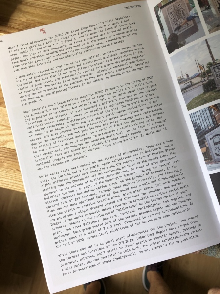 The publishing imprint Frank commissioned del Pesco to contribute a short essay "Encounters" for Piotr Szyhalski’s (sold-out) book COVID-19: Labor Camp Report. "The book embodies Szyhalski’s ceaseless and diligent practice, one that continues to provoke, confront, comfort, and inspire." Szyhalski’s epic endeavor of 225 drawings, made once a day starting March of 2020, offers a space to confront the complexity, uncertainty, absurdity of the pandemic, with equal parts compassion and criticality. The essay was reprinted in Bmore Art coinciding with the first public display of the entire series in summer 2021.