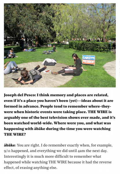 Shortly after moving to Baltimore, del Pesco conducted an interview with the London-Based Collective Åbäke, about their fascination with The Wire.