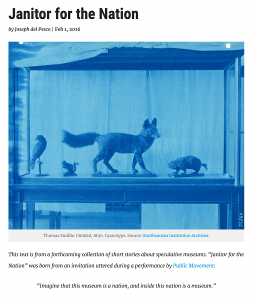 "Each nation lasts about as long as an average exhibition, eight to twelve weeks. On the evening that the current nation closes, its flag, sewn only weeks ago, is slowly lowered and the anthem sung for the last time. No need for a coup d’état. Those with positions in the administration, who’ve barely slept in their short run of the nation, are happy to return to their homes. A new president is elected by the following weekend, and a new constitution ratified before the full moon. Only those present in the museum during the transition of power may vote and be called citizens. Passports are issued, and customs officials replace box-office attendants, gallery guards are transformed into the national guard."